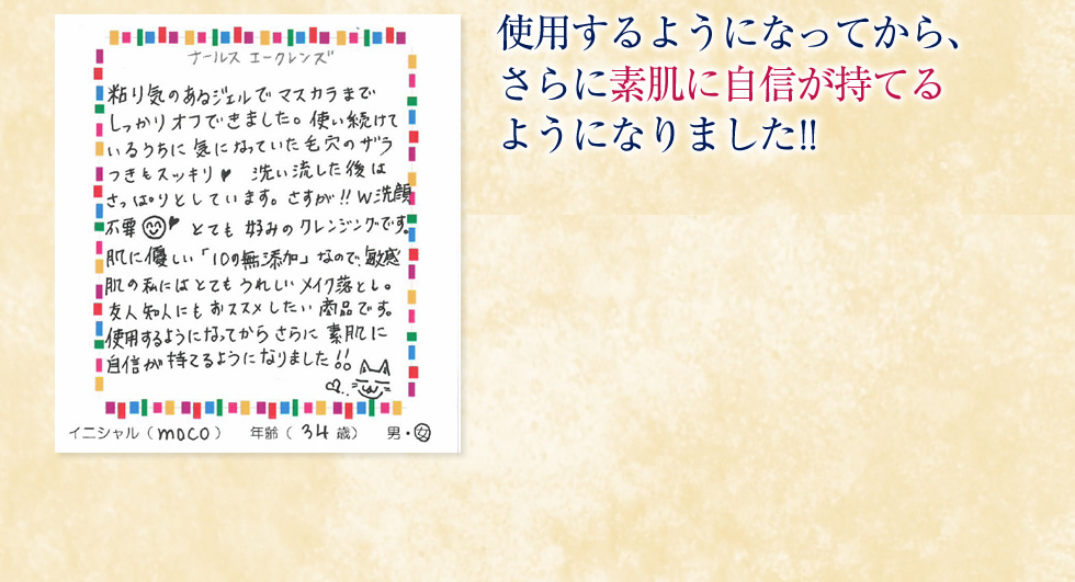 エークレンズを使うようになってから、お顔の印象が明るくなったと言われることが増えて、とっても嬉しいです。