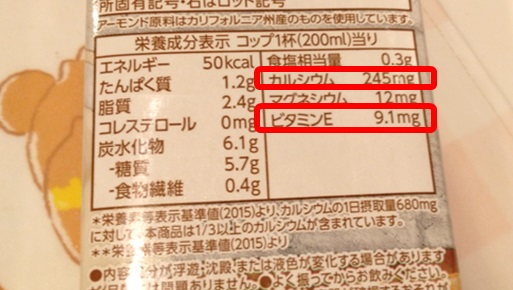 私が普段飲んでいるアーモンドミルクの成分表示をチェックすると、コップ1杯(200ml)で9.1mgも摂取できます。