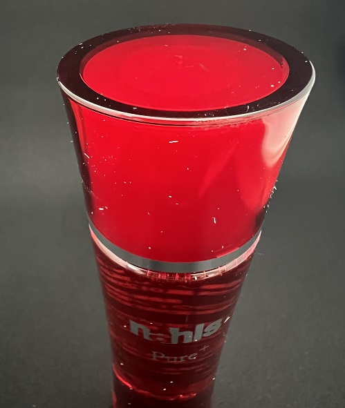 その時は、化粧箱の中に入れていた「中ゲス」という緩衝材のような役割をする紙と、ナールスピュアのキャップの上面が、輸送中に摩擦され続けたたことによって、キャップのプラスチックが削れてしまい、そのプラスチックの粉が付着していました。