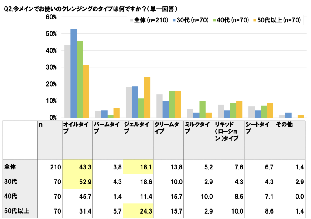 最も多く使われているのはオイルタイプ(全体43.3%)で、特に30代では52.9%と半数を超えています。一方、毛穴汚れやいちご鼻対策を意識する人に人気なのがジェルタイプ(全体18.1%、50代で24.3%)です。ジェルはオイルに比べて肌への刺激が少なく、毛穴汚れをやさしくオフできるのが特徴です。