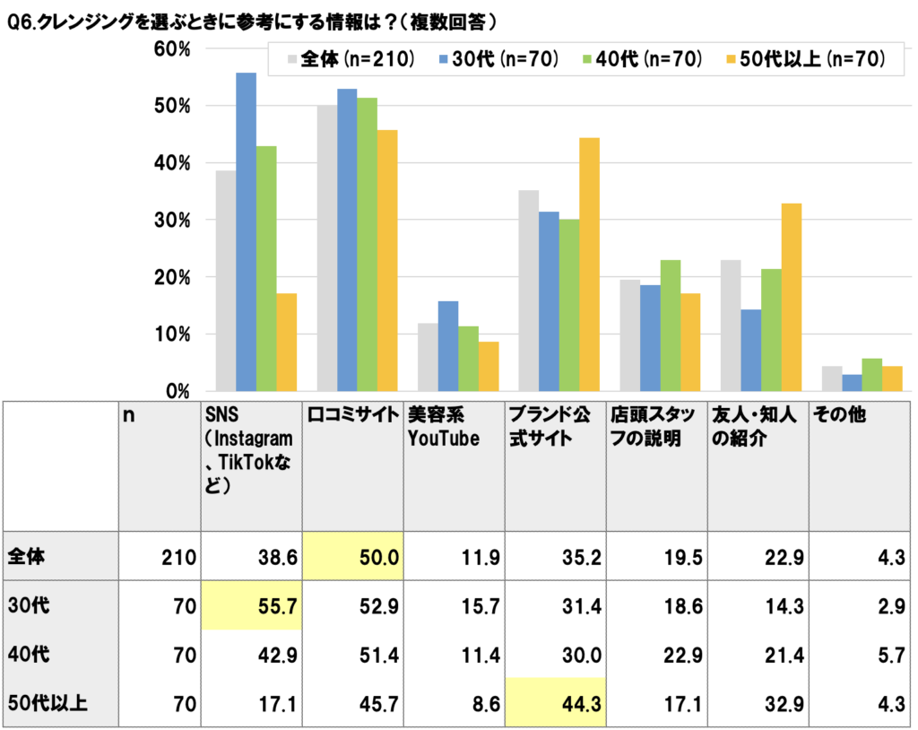 クレンジングを選ぶ際、最も参考にされているのは口コミサイト(全体50.0%)で、実際に毛穴汚れやいちご鼻に悩む人の体験談は信頼度が高いポイントです。特に30代・40代では半数以上が口コミを重視しており、リアルなレビューが購入判断のカギとなっています。また、30代ではSNS(55.7%)を活用する人が多く、動画や投稿で「毛穴汚れへの効果」を確認しています。