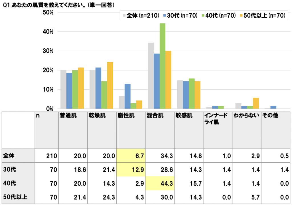 いちご鼻の原因は毛穴に詰まった皮脂や角栓です。そのため、それらをケアできるクレンジング選びが欠かせません。調査結果では脂性肌は全体で20.0%、特に30代は12.9%と高めで、皮脂による毛穴悩みを抱える人が一定数いることが分かります。
