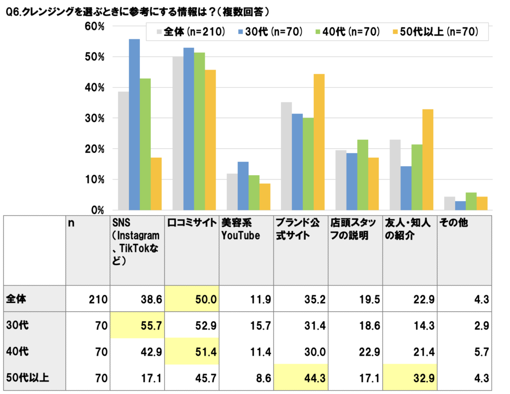 クレンジングを選ぶ際、多くの人が参考にしているのは「口コミサイト」(全体50.0%)です。特に40代では51.4%と高く、信頼できるレビューを重視する傾向が見られます。また、30代は「SNS」(55.7%)を最も参考にしており、最新の美容トレンドを取り入れやすい層といえます。