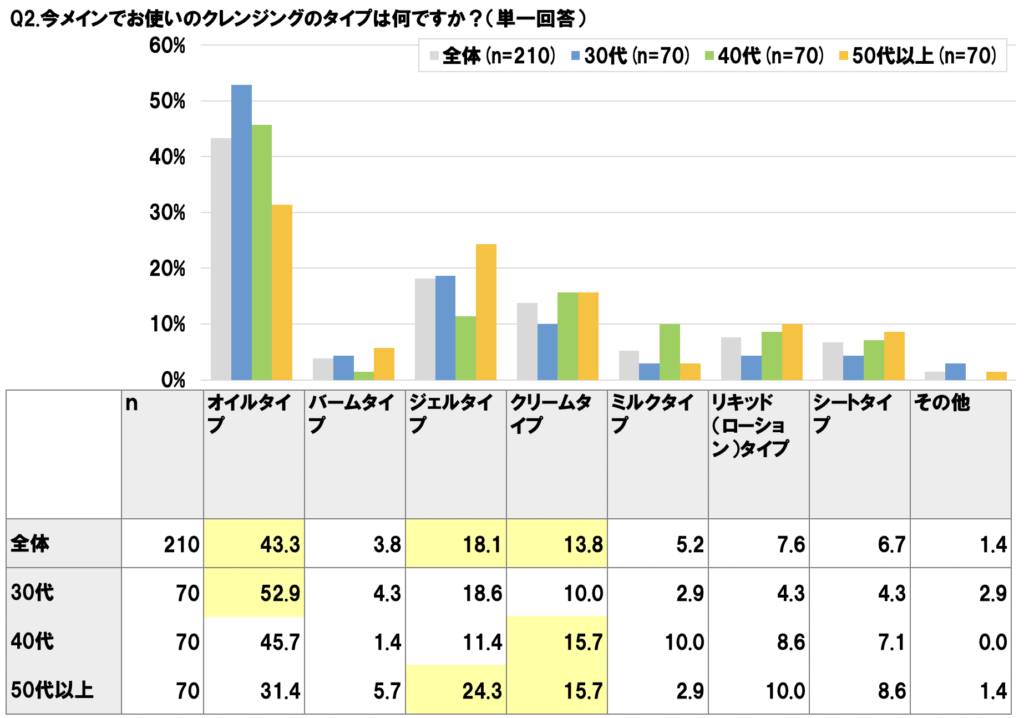 普段どのクレンジングを使っているかを把握することが重要です。調査結果では「オイルタイプ」を使う人が全体の43.3%と最も多く、特に30代では52.9%と過半数を占めています。オイルはメイク落ちが良い一方で、摩擦や乾燥を招くとくすみにつながる可能性があります。