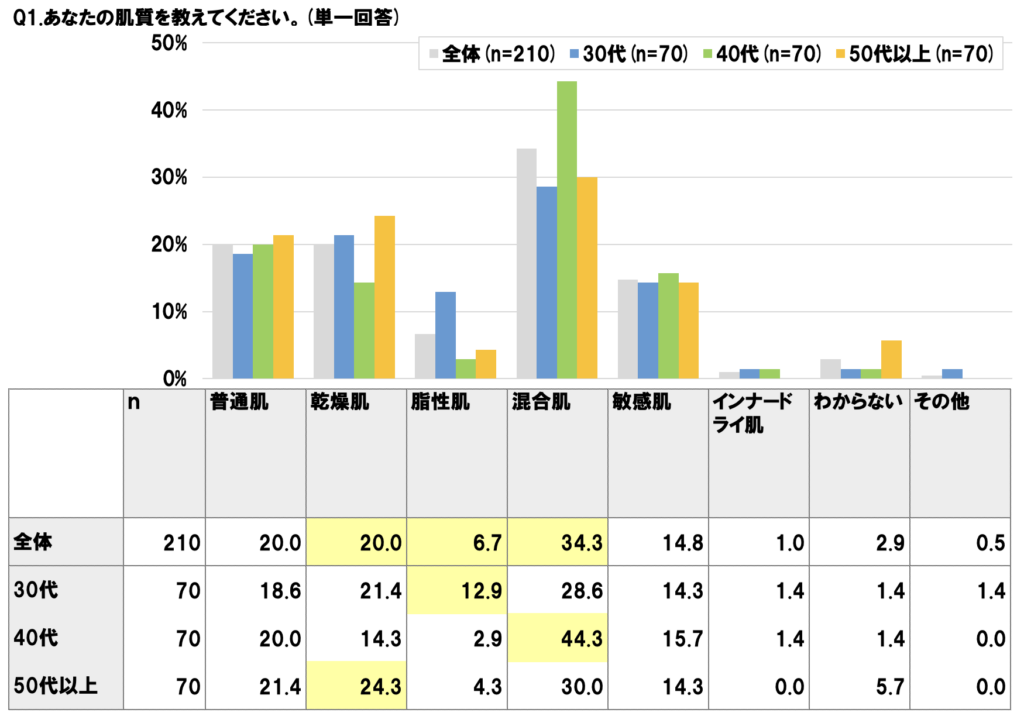 クレンジングを選ぶには、まず自分の肌質を知ることが大切です。調査結果では「混合肌」が全体の34.3%と最も多く、次いで「乾燥肌」と「普通肌」がそれぞれ20.0%を占めています。乾燥や脂性が原因で古い角質や皮脂が残ると、くすみの原因になりやすいです。