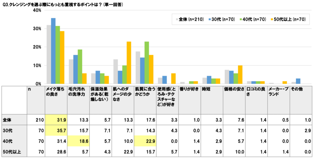 クレンジング選びで重視すべきポイントを理解することが大切です。調査では「メイク落ちの良さ」が全体の31.9%で最も多く、特に30代では35.7%と高い数値を示しています。しかし、肌のくすみを防ぐには「毛穴汚れの洗浄力」(全体13.3%、40代では18.6%)や「肌質に合うかどうか」(全体17.6%、40代22.9%)も重要です。