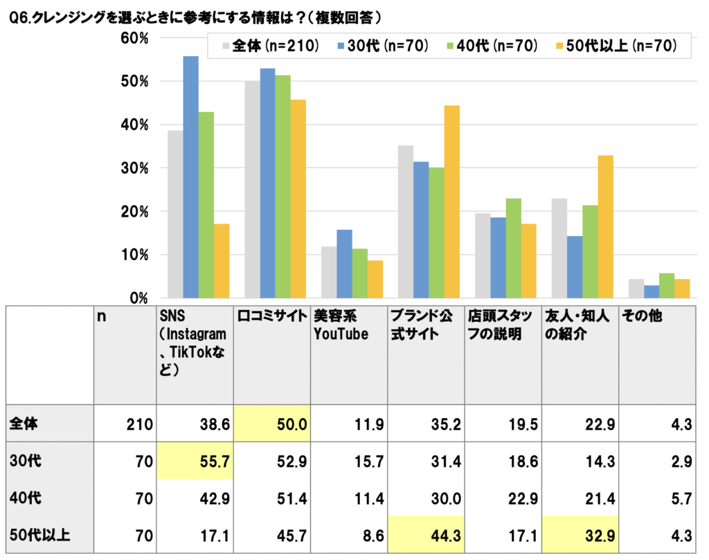 クレンジングを選ぶ際に多くの人が参考にしているのは、口コミサイト(50.0%)やSNS(38.6%)です。特に30代はSNSの利用率が高く(55.7%)、動画やレビューを通じてオイルフリー処方の商品を比較しています。一方、50代ではブランド公式サイト(44.3%)や友人・知人の紹介(32.9%)を重視する傾向が強く、信頼性のある情報源を参考にしていることが分かります。