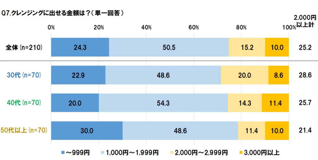 一方で、50代は〜999円が30.0%とコスパ重視の傾向が強く、価格と品質のバランスを重視していることが分かります。