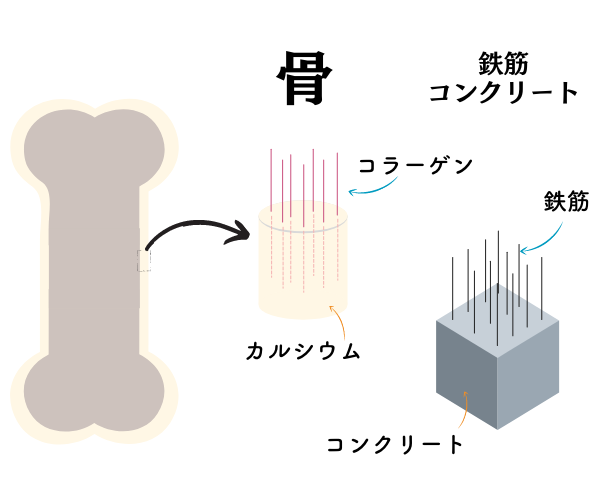 骨を鉄筋コンクリートに例えると カルシウムがコンクリートの役割で、コラーゲンが鉄筋の役割を果たしています。