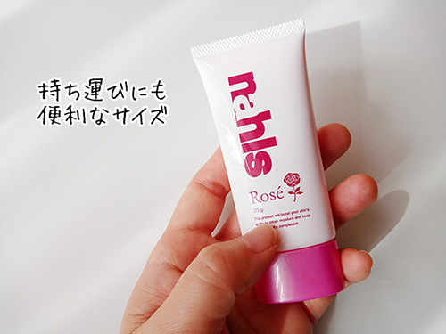 ナールス ロゼは手のひらサイズのチューブ入り。外出時もポケットに入れて連れていけるサイズ感です。