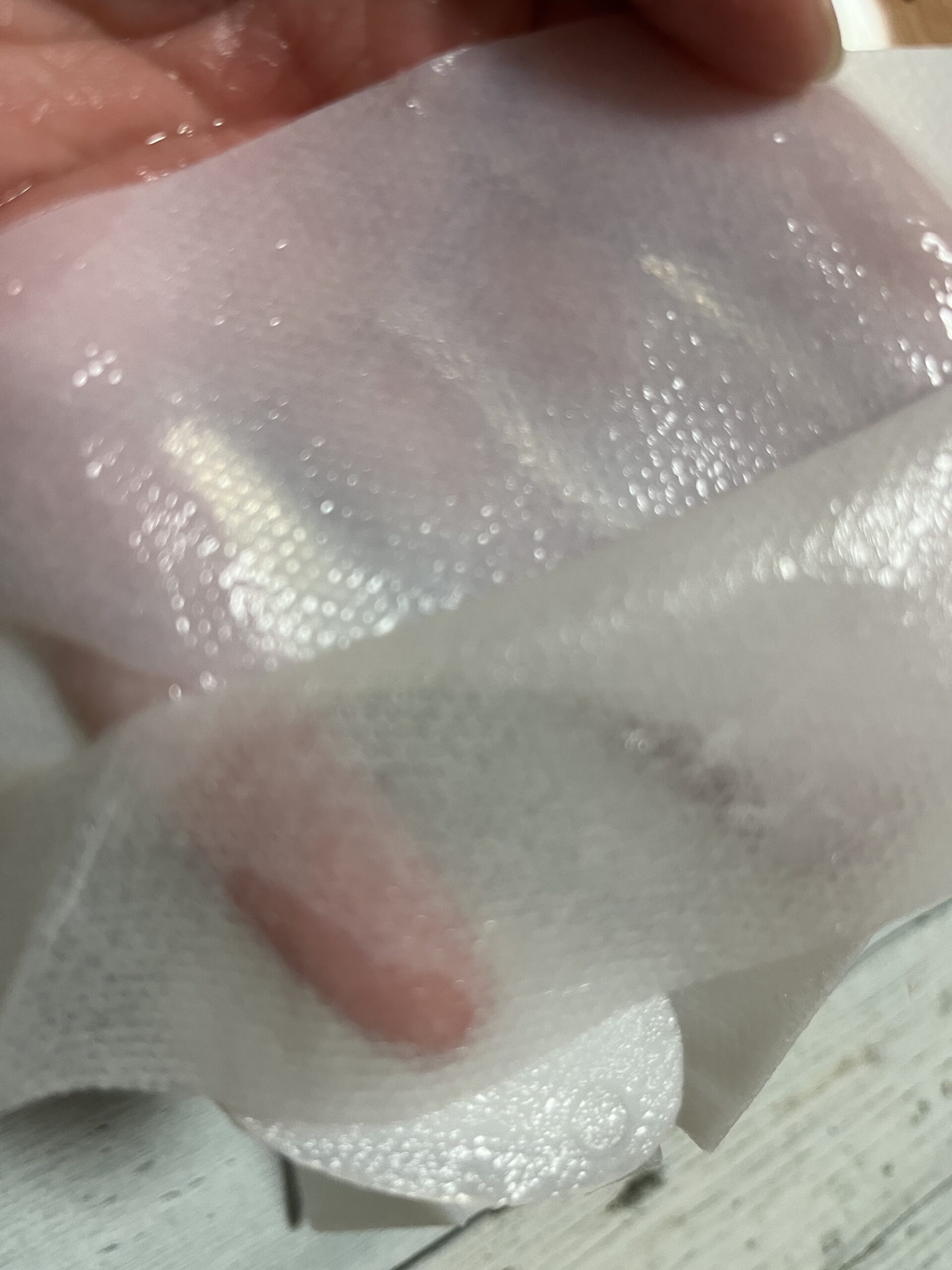 実際使ってみると、プルプルのマスクで肌にピタッと吸い付くかんじ。洗顔後お化粧水をつけ、このマスクをつけ15分後いつもならマスクが水分が飛んでいってカサカサになりますが、こちらのマスクはずっとプルプルでお肌に水分を与え続けている感じがありました。