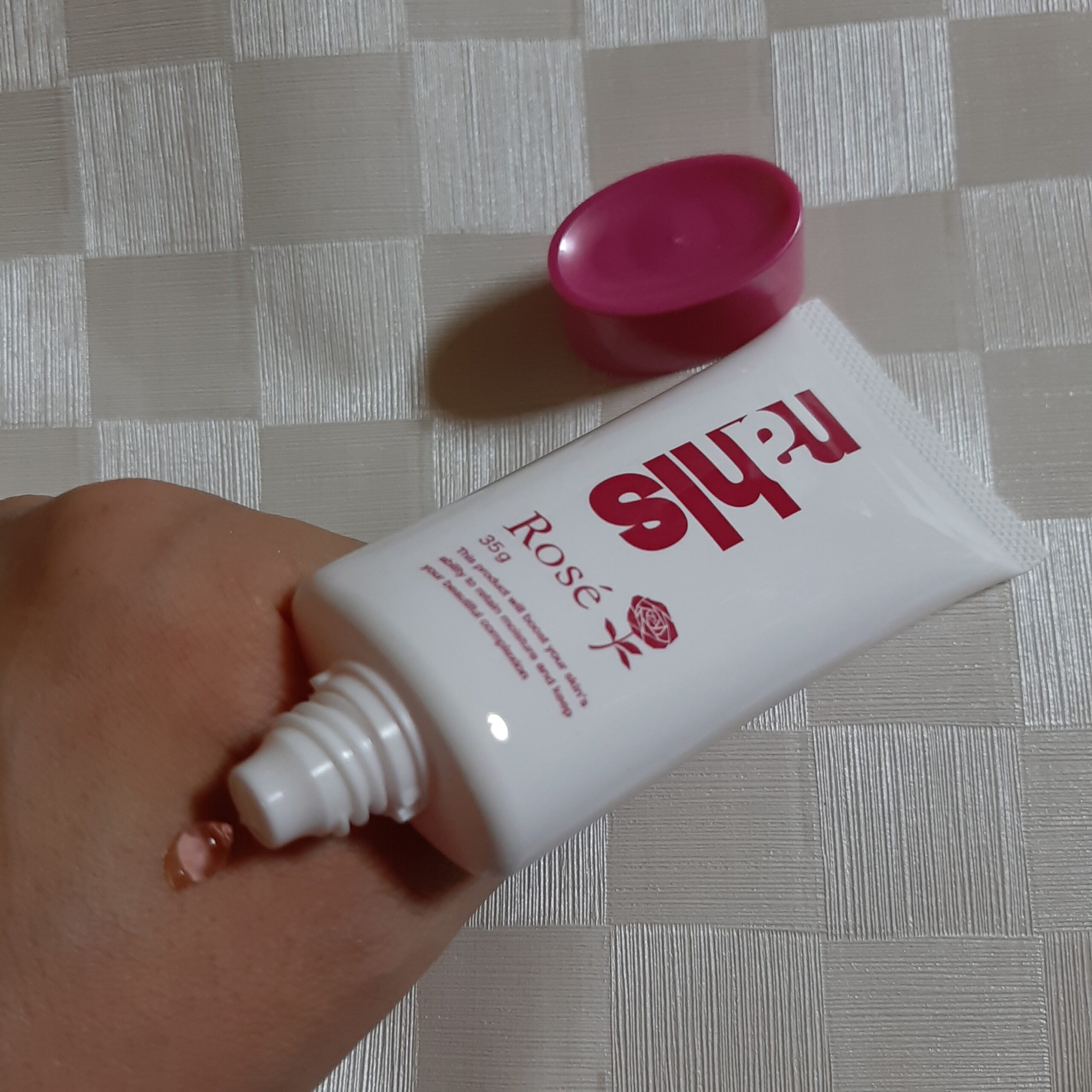ナールスロゼは、薄いピンク色のジェルで、手につけてなじませると、手指全体に薄いヴェールをはったような感じになります。
