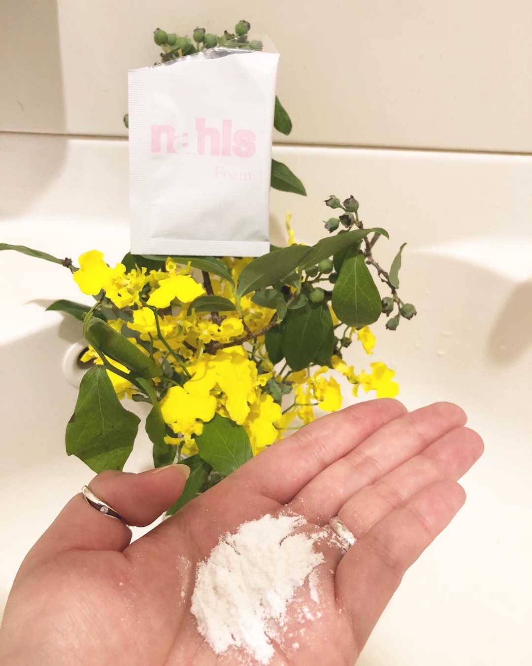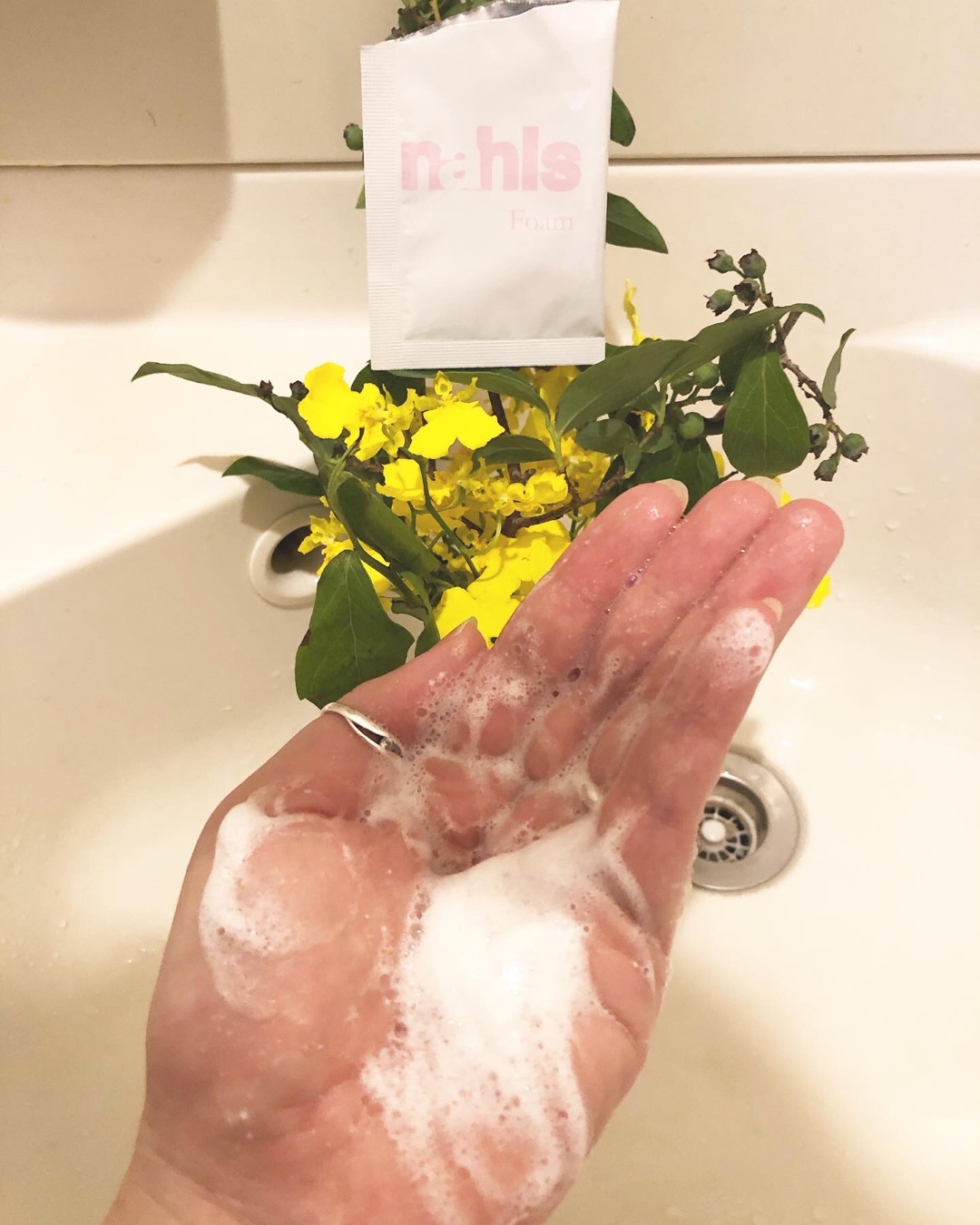 手のひらにとったナールス フォームにぬるま湯を加えていき、空気を含ませるように泡立てます。